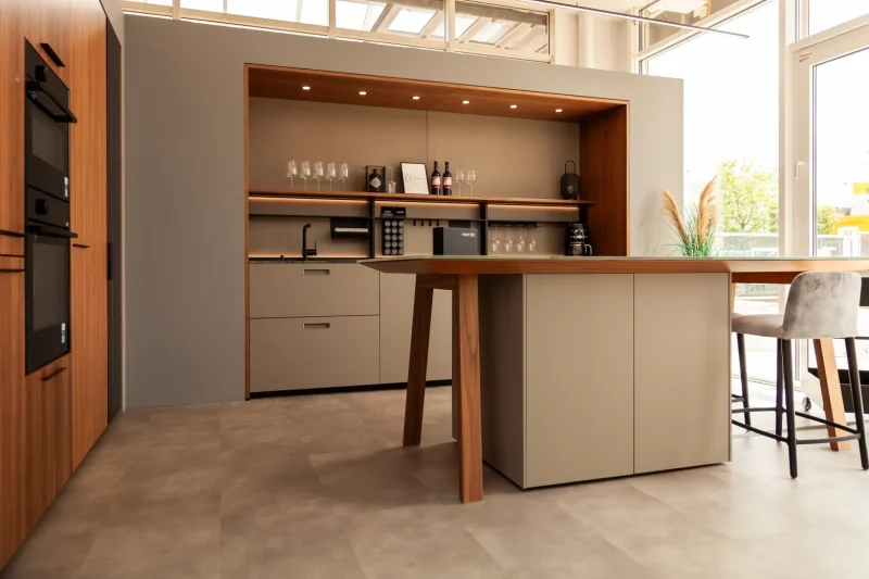Je nach Grundriss eignen sich Küchenzeile, L-Form, U-Form oder eine Insel. In kleinen Räumen arbeiten wir mit deckenhohen Hochschränken, Auszügen mit Vollauszug, Ecklösungen (Le-Mans/Magic Corner) und durchdachter Innenorganisation, damit jeder Zentimeter wirkt. In offenen Wohnbereichen sorgt eine Insel für zusätzliche Arbeitsfläche, Kommunikation und – in Kombination mit einem Kochfeldabzug – für freie Sicht.