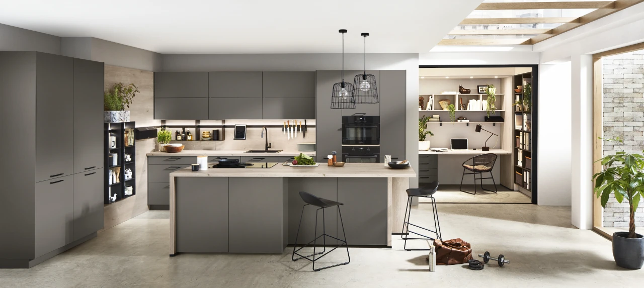 Diese Küche zeigt, dass für einen optimalen Küchenablauf wenige Küchenkomponenten genügen. Und weil es hier um eine richtige Wohnküche geht, gibt es auch einen großzügigen Essplatz mit offenen Regalelementen für die Unterbringung von Küchenutensilien.