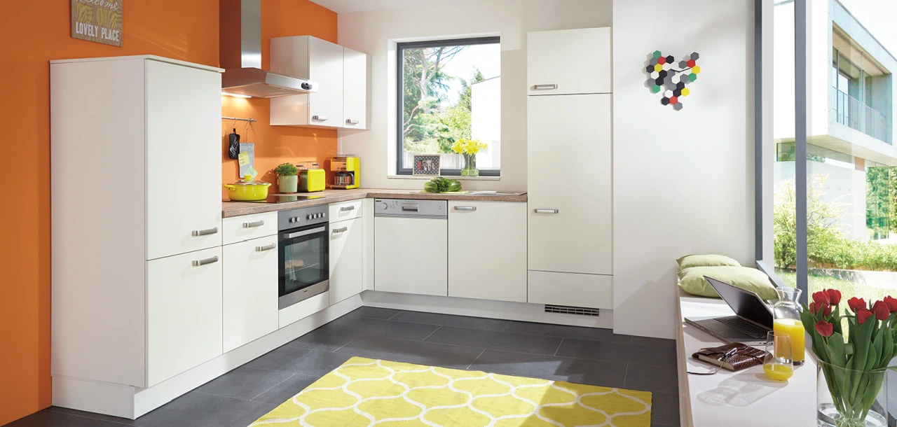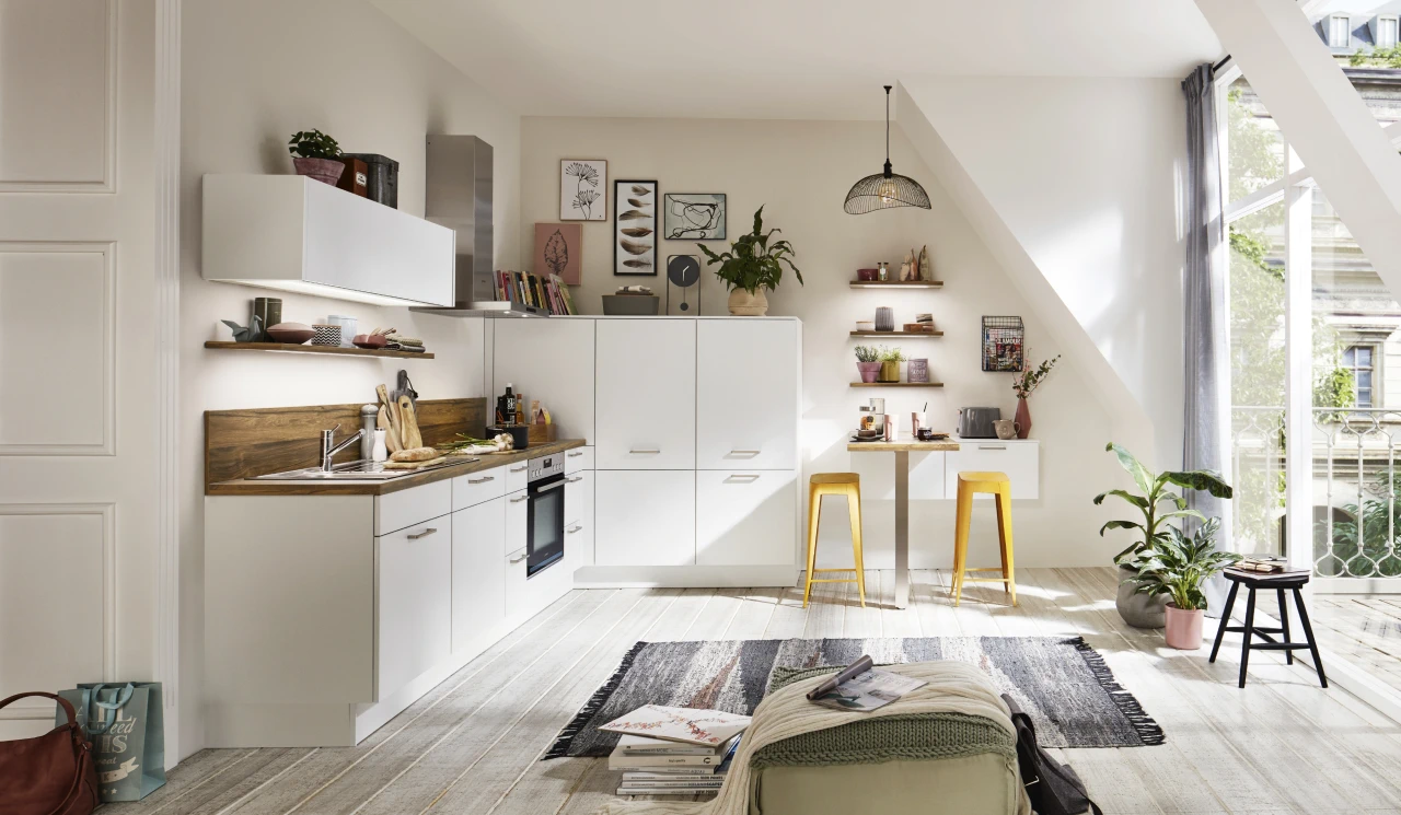 Eine weiße Küche ist stets gleichzeitig zeitlos und modern. In Kombination mit Holzdekor bringt sie eine wohnliche, ländliche Note in jeden Raum. Griffe aus Edelstahl passen beispielsweise perfekt zur feinen Eleganz der weißen Fronten.