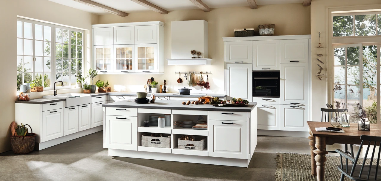 Der dekorative, offene Stauraum gibt der klassisch weißen Landhausküche eine besonders kreative und wohnliche Atmosphäre. Einfach aufatmen und wohlfühlen!